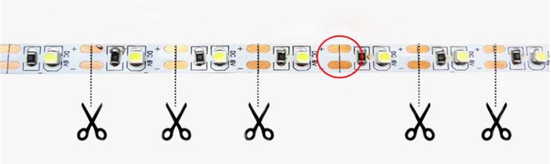 De vuist regel is dat als u 30 Leds/m ledstrips heeft u om de 3 leds kunt knippen, en wanneer u een 60 Leds/m ledstrip heeft u om de 6 leds kunt knippen.
