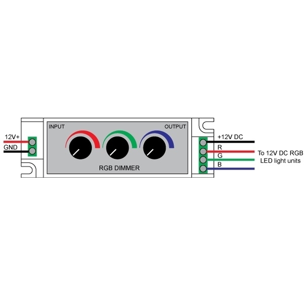 Dit compacte apparaat biedt de mogelijkheid om de intensiteit van de rode, groene en blauwe kanalen van de aangelsoten RGB LED strip (niet meegeleverd) onafhankelijk regelen en dus de kleur en helderheid. Dit gebeurt met drie roterende potentiometer, die zich bovenop de behuizing bevinden.