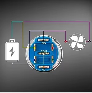 - NO (Normally Open): Deze aansluiting maakt verbinding met COM zodra de schakelaar op ‘aan’ gezet wordt. Hier sluit je de plus (+) van het apparaat (bijvoorbeeld ventilator, lamp, apparaat) aan.