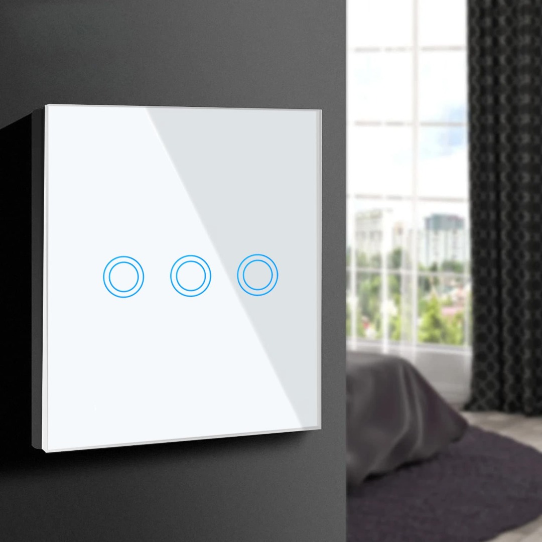Met deze moderne wandschakelaar maakt u uw verlichting helemaal af. De schakelaar heeft 3 uitgangen en is dus drievoudig. Bovendien is de schakelaar aanrakingsgevoelig, waardoor u de schakelaar met slechts uw vingertopje kunt bedienen. De schakelaar is daarnaast voorzien van handige verlichting, waardoor deze ook goed te vinden is in het donker. De schakelaar is wit en heeft een afmeting van 86 x 86mm. De inbouwdiepte van de schakelaar is 33mm. De schakelaar is gemaakt van gehard glas, en is daardoor ook waterproof. Dit maakt de schakelaar ook prima bruikbaar op vochtigere plekken zoals uw keuken of badkamer.
