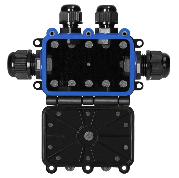 Voorzien van 2 dubbele 3-aderige snelkoppelingen (0,75–4 mm²) en een klassieke schroefconnector voor een snelle, betrouwbare aansluiting. De zwarte behuizing (RAL 9005) met siliconen afdichtingen garandeert maximale bescherming tegen vocht, stof en mechanische schade.