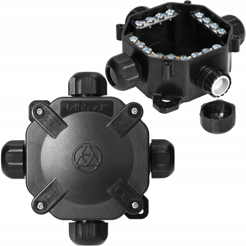 Water- en stofdichte vierkante lasdoos met IP67-certificering, 4 kabelwartels en 5 verwijderbare verbindingsbruggen. Geschikt voor onder andere ster- en driehoekschakelingen.