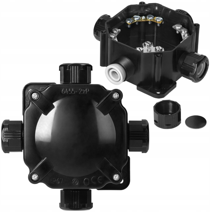 Water- en stofdichte vierkante lasdoos met IP67-certificering, 4 kabelwartels en 5 verwijderbare verbindingsbruggen. Geschikt voor onder andere ster- en driehoekschakelingen.