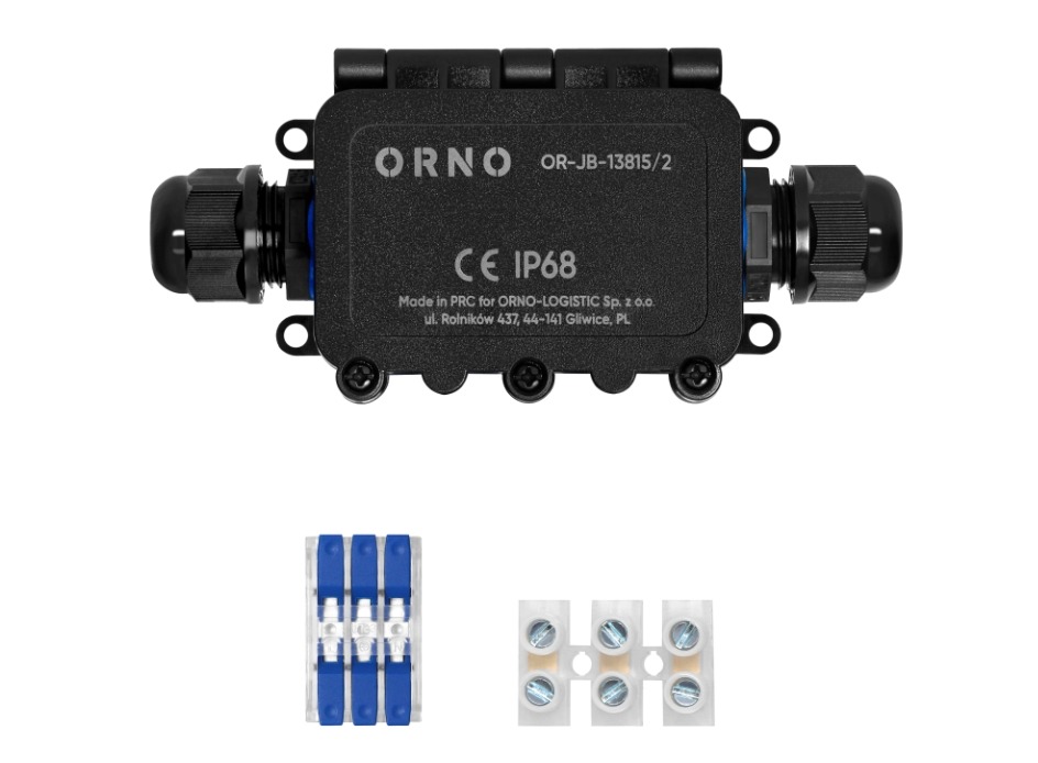 De behuizing is gemaakt van slagvast, UV-bestendig thermoplast (PC/PA66), en voldoet aan de IK09 schokbestendigheidsnorm en de UL94 V2 vlamvertragende classificatie. De doos is voorzien van twee hoogwaardige kabelwartels: