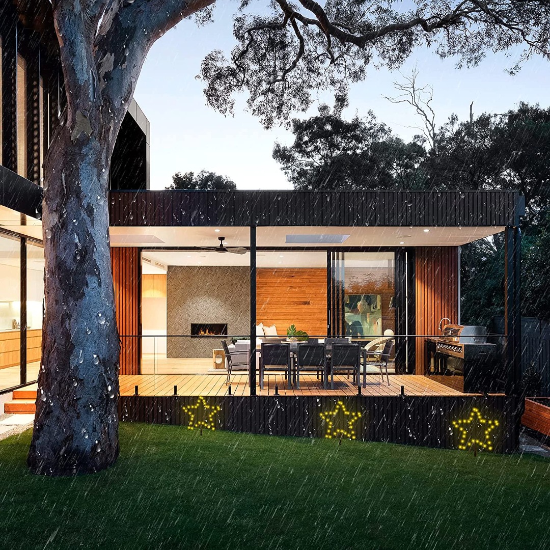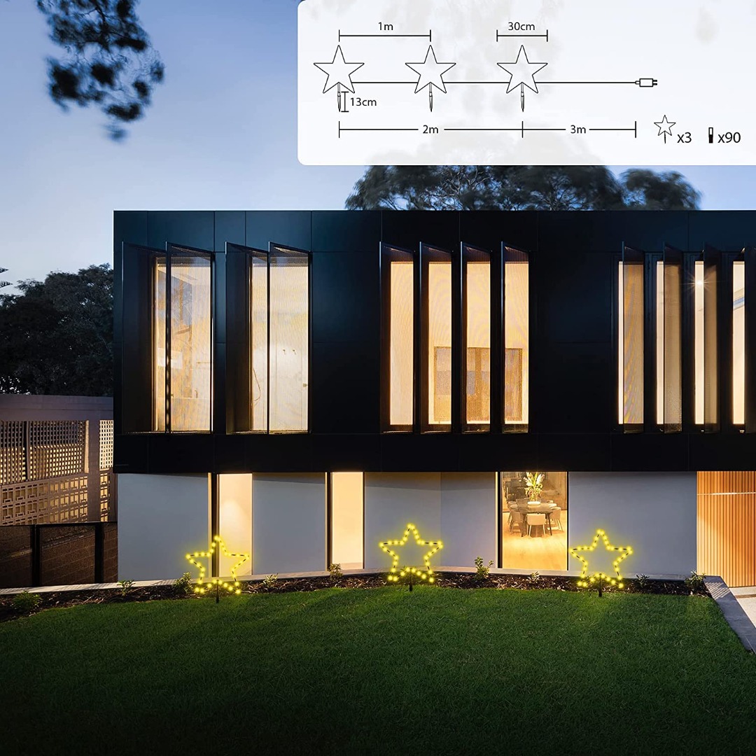 Met deze kerststerren set maakt u uw tuin helemaal klaar voor de kerst- en wintertijd. De sterren zijn elk 30cm in diameter, en zijn bedraad met een donkergroene voedingskabel. De totale lengte is 5 meter, met tussen elke ster een meter aan voedingsdraad. De sterren zijn IP44 waterproof, en zijn dus prima bestand tegen een flinke regen- of sneeuwbui. De sterren hebben een warm witte lichtkleur en zijn zeer energiezuinig.