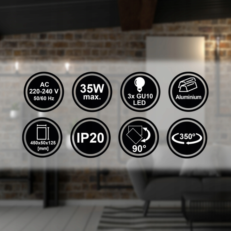 Deze moderne en strak afgewerkte plafondspot is voorzien van 3 GU10 fittingen waar een lichtbron in kan worden geschroefd. Hierdoor is deze spot ideaal om aan uw plafond te monteren, om bijvoorbeeld de gang of een kamer te verlichten. De spots zijn verstelbaar en kunnen in een draaihoek van 350° gedraaid worden. De plafondspot heeft een maximaal vermogen van 35 Watt, en is gemaakt van hoogwaardig aluminium.