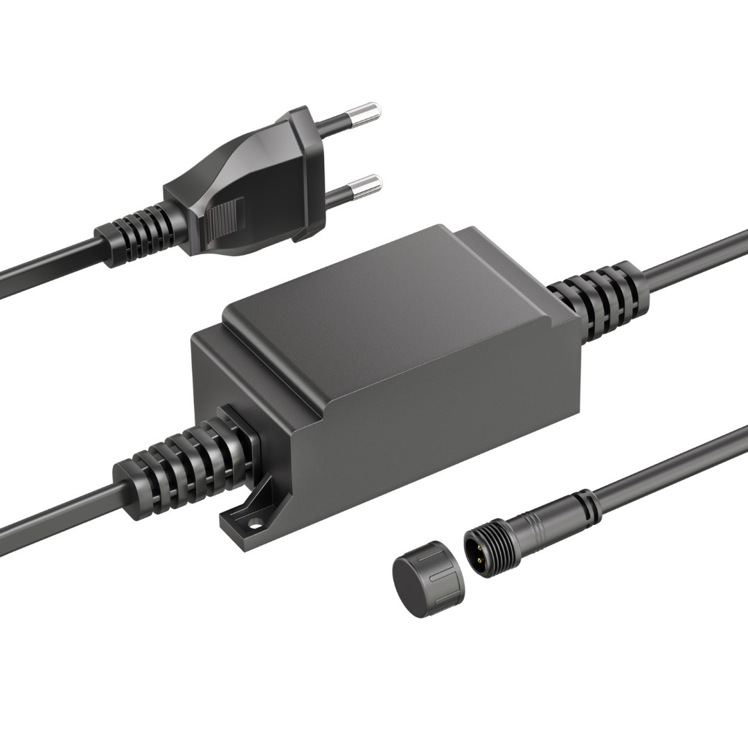 Deze transformator maakt het mogelijk om uw 12 Volt tuinverlichting aan te sluiten op een stopcontact. De transformator is erg compact en gemakkelijk weg te werken, en is voorzien van 4 montagegaten om zo de transformator in te bouwen. De transformator zelf is voorzien van een IP67-rating, wat inhoudt dat de transformator compleet water- en stofdicht, waarbij de voeding een male aansluiting heeft voor uw tuinverlichting. Deze aansluiting is IP44 waterproof. De transformator heeft een kabel voor aansluiting op het lichtnet met een lengte van 1 meter, en een kabel voor aansluiting op de eerste lamp van 0,5 meter.