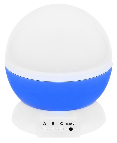 Deze mooie nachtlamp verzekert u ervan dat uw kind lekker slaapt. De nachtlamp heeft namelijk een ingebouwde projector die u kunt gebruiken als u de cover van de lamp af haalt. Daarop staan allerlei nachtelijke figuurtjes (sterren, maantjes, etc.), die op de muren en het plafond van de slaapkamer geprojecteerd worden en langzaam ronddraaien. Dit zorgt voor een aangename sfeer in de kamer van uw kind, wat ervoor zorgt dat uw kind minder bang is voor het donker en op die manier rustiger en fijner slaapt. Verder wordt de nachtlamp ofwel gevoed door 3 AA batterijen (niet meegeleverd), ofwel door de meegeleverde USB-kabel die u op een lichtnetadapter kunt aansluiten. Deze lamp heeft een blauwe behuizing.